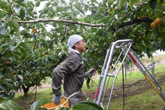 待柿子成熟時,果農們會架著梯子爬上樹去進行手工摘採